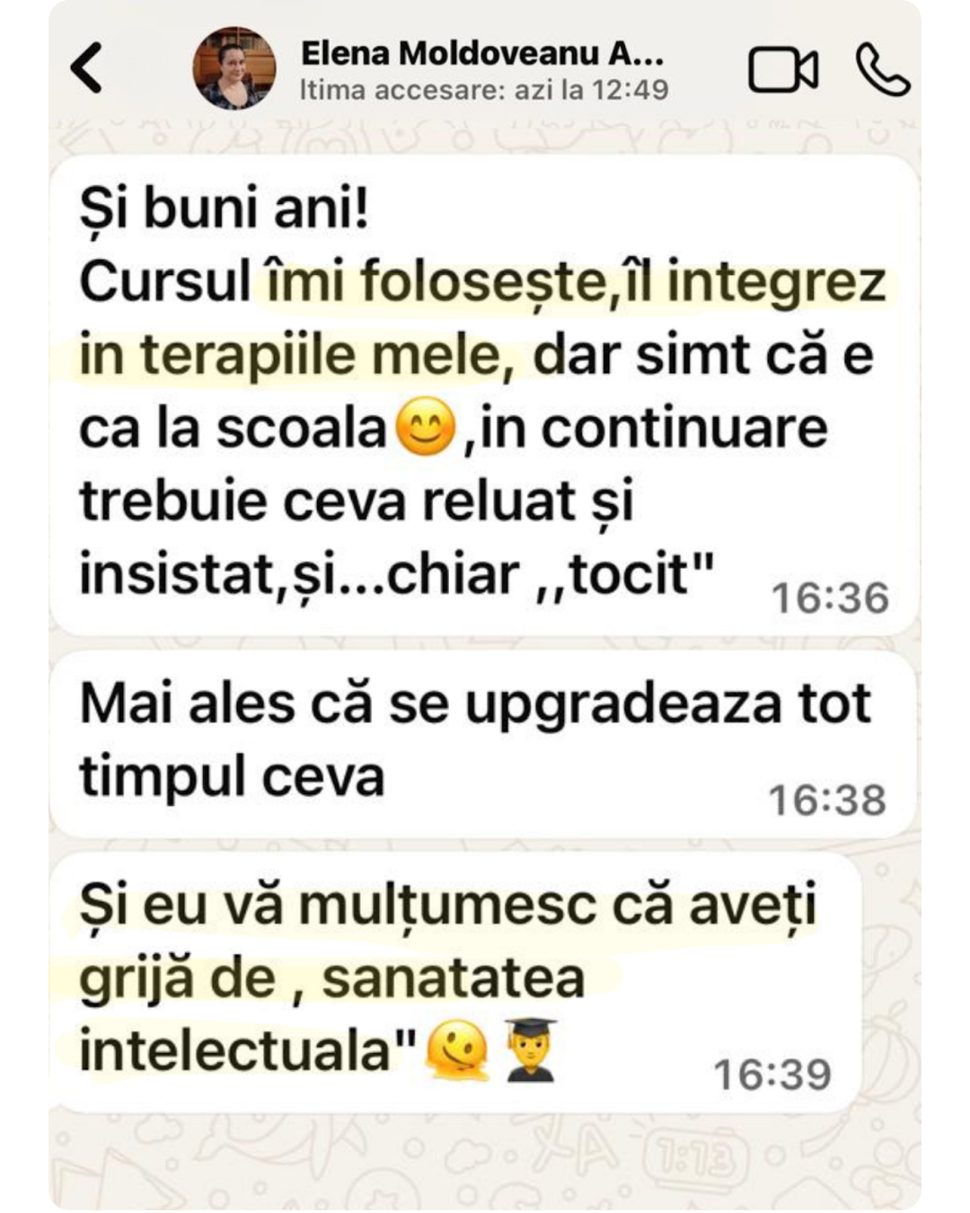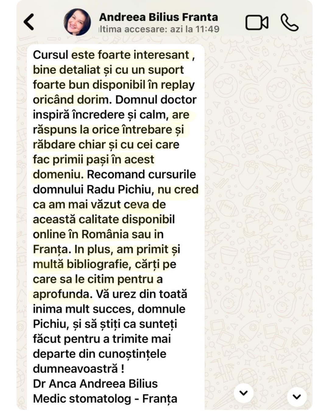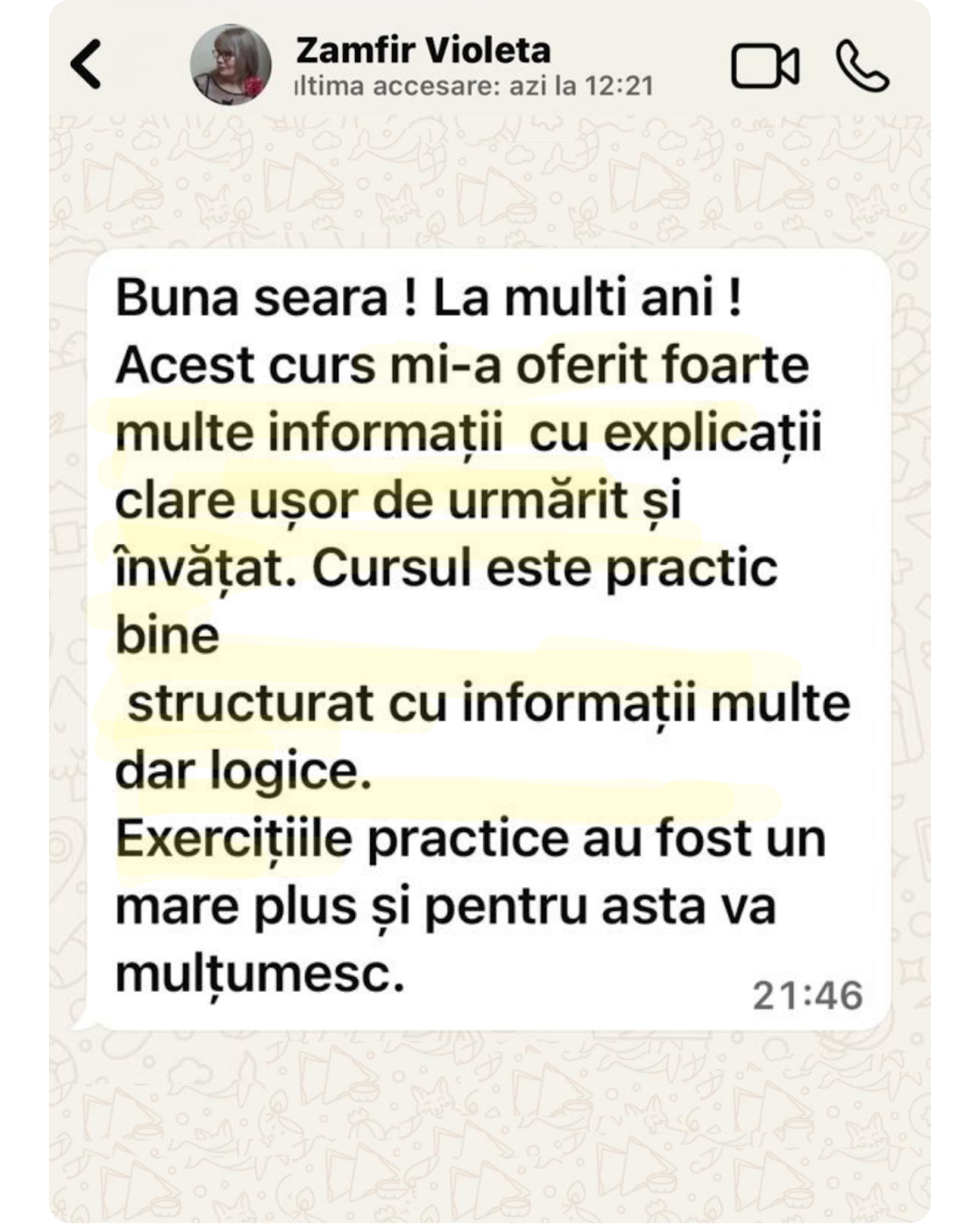 După ce ai achiziționat cursul, intri într-un grup de WhatsApp. Timp de 3 luni, primești răspuns la întrebările pe care le ai din materialul de curs.