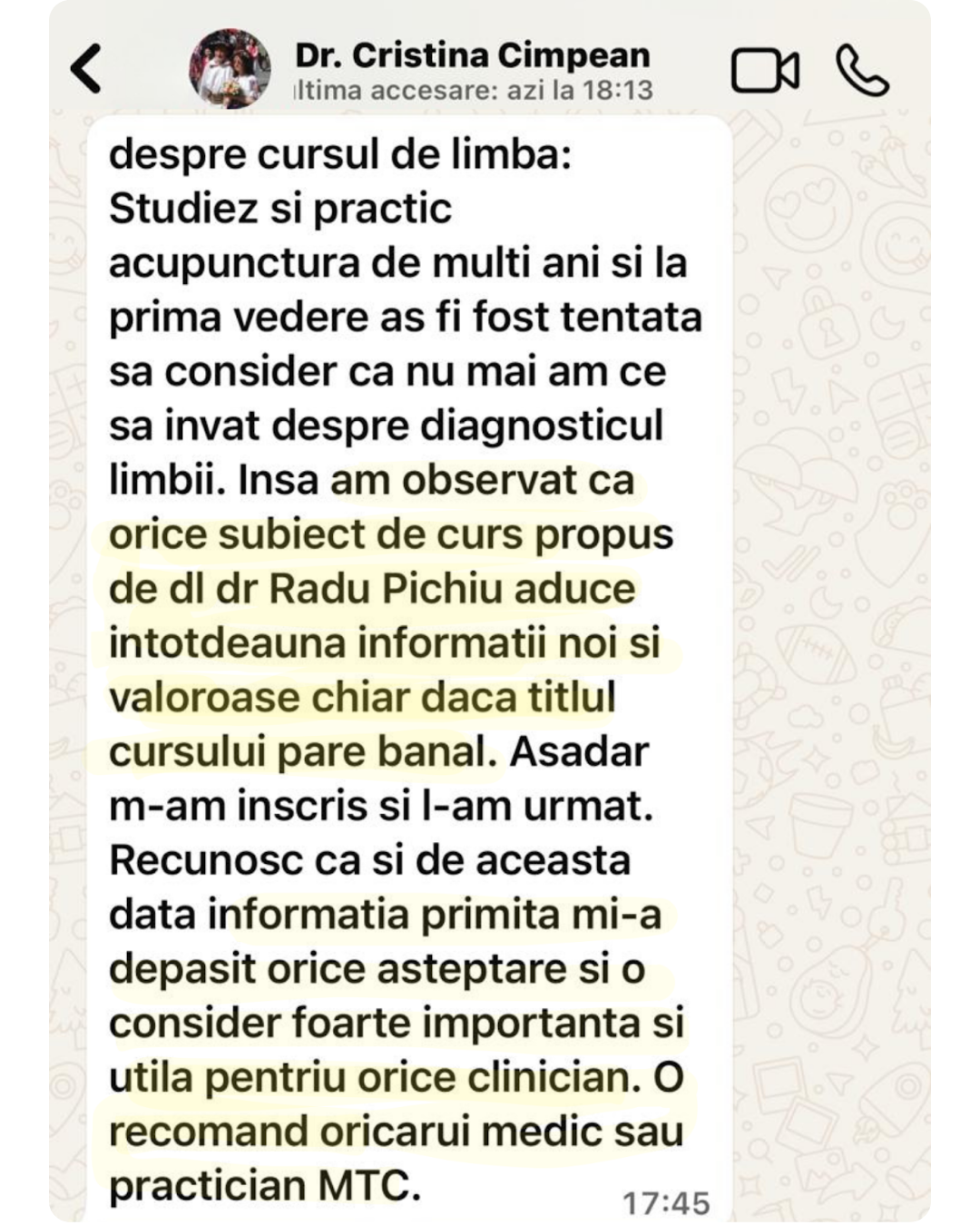 Tocmai de aceea, cursurile noastre sunt concepute pentru a-ți oferi exact acest avantaj. Cu peste 20 de ani de experiență clinică și studii aprofundate în China, Danemarca și Elveția. De asemenea s-a specializat în medicină clasică chineză cu lectori din America, din școala maestrului Jeffrey Yuen. Astfel, dr.Radu Pichiu îți oferă prin cursurile și webinariile sale acces la modul său de gândire, bazat pe practică, dar și pe rezultate dovedite.